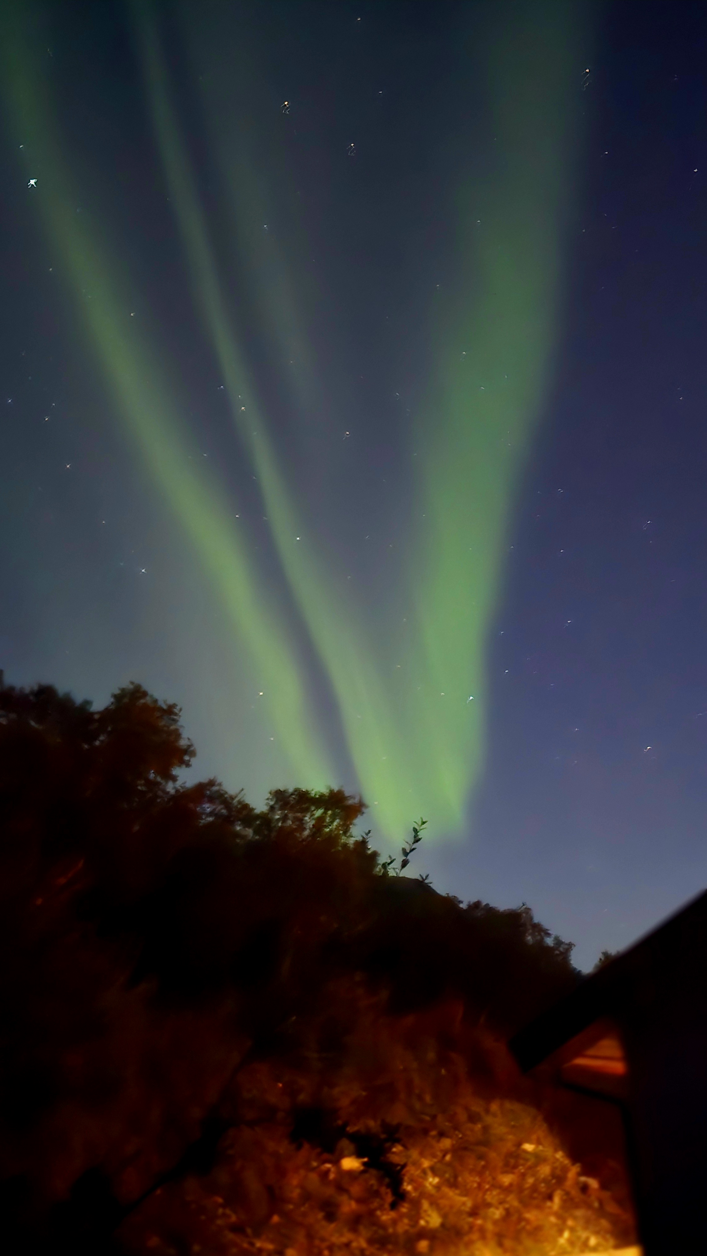 Men så kom det magiske nordlyset opp – nesten alt lys ble slått av og bare bålet lyste opp. Så kom den ene stripen med nordlys etter den andre. Det var mange som så nordlys for første gang. Det ble en nesten hellig og magisk opplevelse.